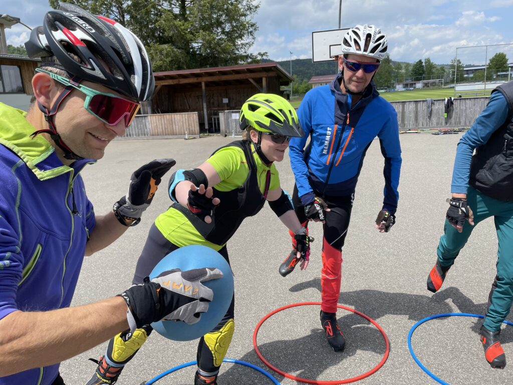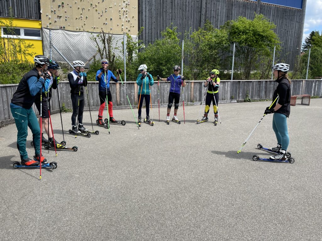 Am Sonntag wurden dann die Rollski ausgepackt. Diverse Übungen zum Aufwärmen fanden auf dem Hockeyplatz statt, danach ging es auf die Radwege rund um Wildpoldsried. Alle Teilnehmer bekamen eine Langlauftechnik die sie als „Lehrproben“ Thema an das Team vermitteln mussten. In der Praxis konnte dann gemeinsam geübt und verbessert werden, alle Themen wurden dann auch direkt im Anschluss auf technische Inhalte, die verwendete Methodik und das Lehrverhalten besprochen. Auch hier waren alle Teilnehmer:innen voll motiviert dabei und die „Referenten“ wurden unter der Anleitung des Trainers Stefan Leicht gemeinsam analysiert.
